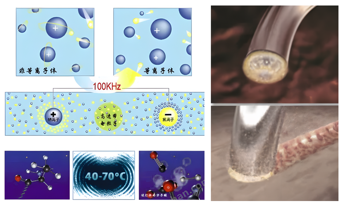 作為能量外科器械的革新者,其輸出頻率低于高頻電刀(等離子刀脫胎與高頻電刀),專(zhuān)注于精細切割與組織消融,保護周邊組織,成為高頻電刀的得力補充。在耳鼻喉、運動(dòng)醫學(xué)等領(lǐng)域廣泛應用。等離子刀憑借脈沖射頻技術(shù),通過(guò)產(chǎn)生等離子體蒸汽層,實(shí)現低溫組織切割與消融,顯著(zhù)減少熱損傷。其低溫操作特性(40-70℃),相較于其他器械的350-700℃高溫,更顯安全高效。下圖左邊是等離子體(又叫電漿,是物質(zhì)的第四狀態(tài):固液氣和等離子態(tài)),右邊是等離子手術(shù)刀切割效果。